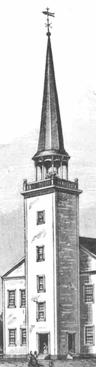 All of these components served to form a multi-storied structure atop the church. Not all components were built into all steeple towers. Below are two photos. The one on the left illustrates the general description given above of a typical steeple tower. The one on the right is a sketch of our original 1797 steeple. Ours would be termed a spired belfry because there was only a spire and a belfry upon the tower base. Note the very tall spire and that our tower base was built from the ground up.
